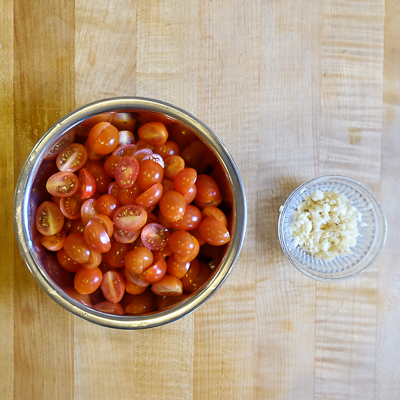 ミニトマトはたて半分に切り、にんにくはみじん切りにします。