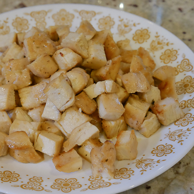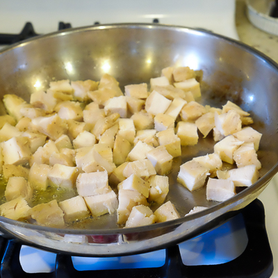 フライパンにオリーブオイルとバターを熱し、強火で一口大に切った鶏肉をこんがりと焼きます。