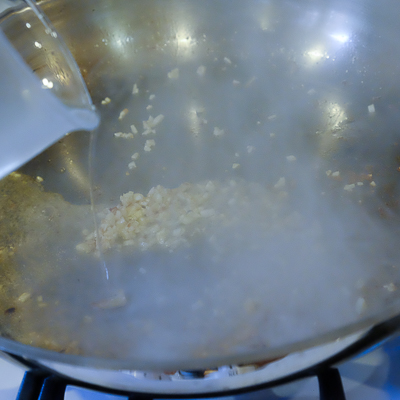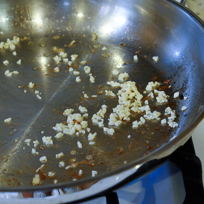 中火にし、同じフライパンににんにくのみじん切りを入れ、さっと炒める。