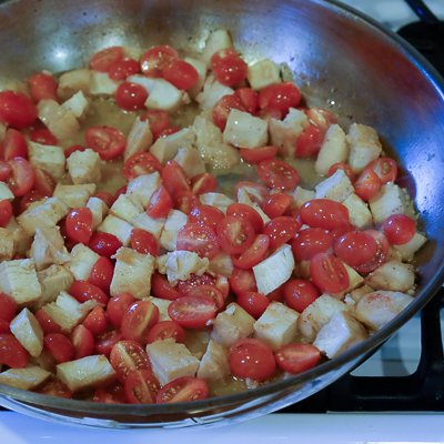ソースがに詰まったら、鶏肉とトマトを入れて軽く火を通します。