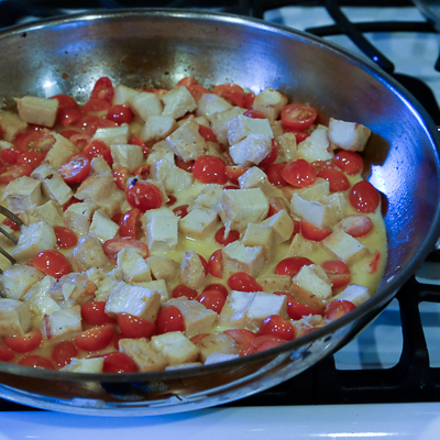 - フライパンのスープが半分くらいまで煮詰まったら、生クリームを入れ、一煮立ちしたら鶏肉とトマト入れ、軽く温める。