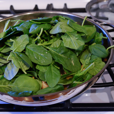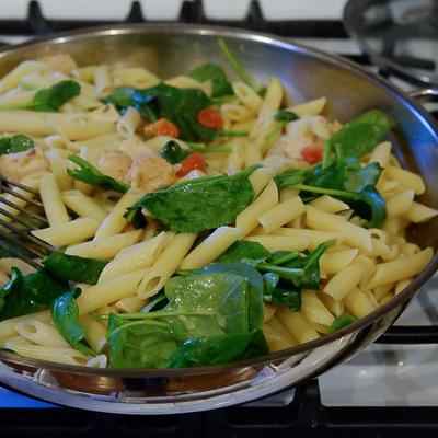 - 火を止めてほうれん草とお湯をきったペンネを入れて、混ぜ合わせる。(ほうれん草は余熱で火を通す)
