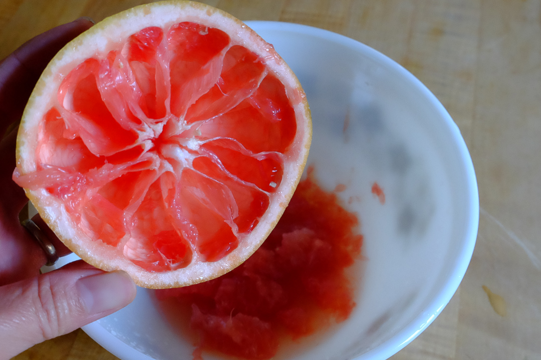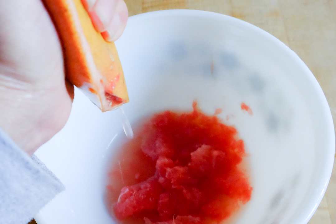 1.グレープフルーツを横に半分に切り、果肉をスプーンで取り出していく。その際出てくる果汁も残さず一緒に取り置く。