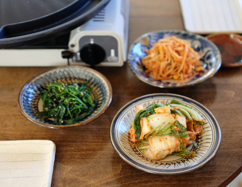 キムチ、ほうれん草のナムル、それからもやしのピリ辛ナムル。