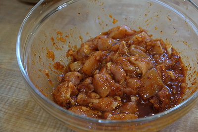 1.たれの材料をすべて混ぜて、一口大に切った鶏肉を30分以上漬け込む。