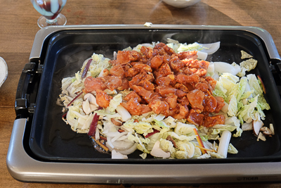 3.ホットプレート(なければフライパンでも)を180℃に温め、ごま油をしいて野菜とトッポギを乗せる。その上に、マリネしてあった鶏肉をたれごと乗せる。