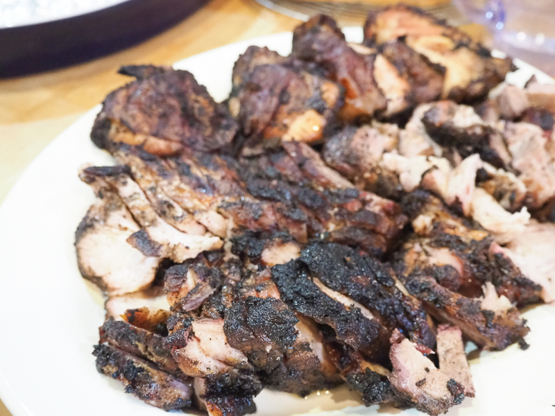 どちらのお肉も、スパイシーなジャマイカのジャークソースに半日ほどつけてから、焼いています。