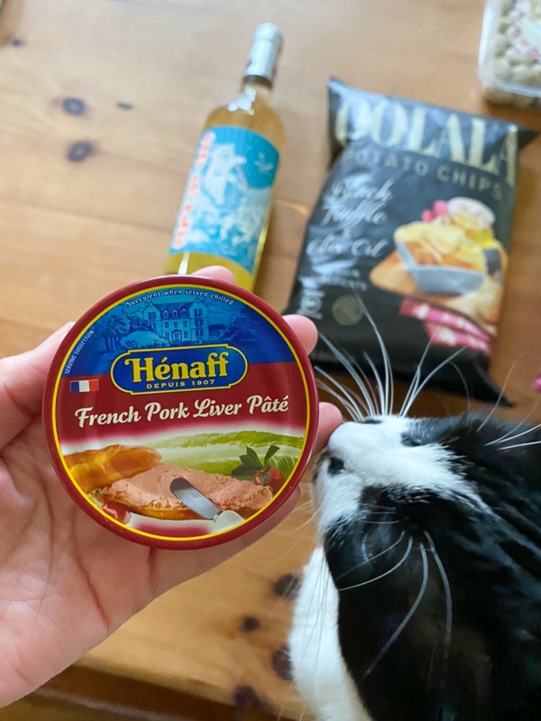 トリュフ味のポテトチップス(これはアメリカ製)、スイートチリ&アイリッシュレッドペッパーのポテトチップス(アイルランド製)、フランスのパテ、イタリアのペスト風味のニョッキ、パケ買いしたフランス産ワイン。