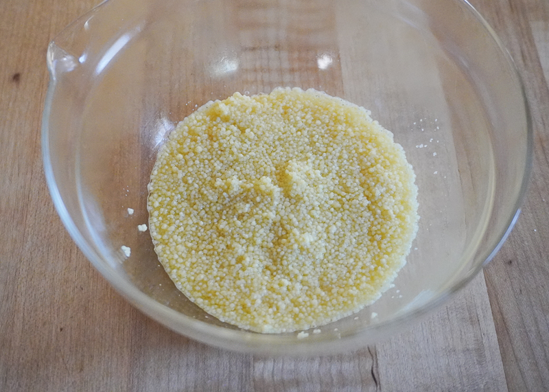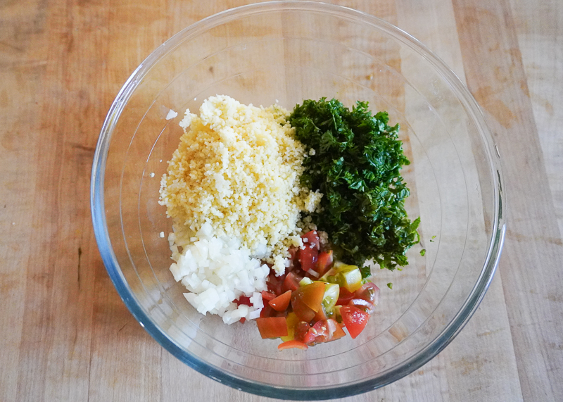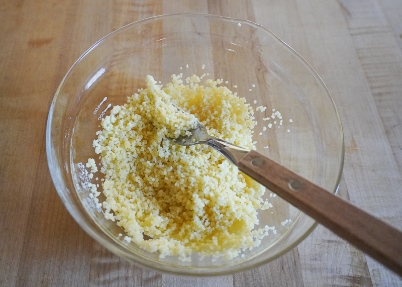 1. クスクスをボウルに入れ、分量外のオリーブオイル小さじ1と塩ひとつまみをまぶし、クスクスと同量の熱湯をまわしかけ、さっと混ぜたらお皿(またはラップ)などで蓋をして、10分蒸らす。