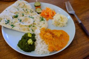 絶品チキンティッカマサラ、ほうれん草のカレー、ガーリックナンのディナー