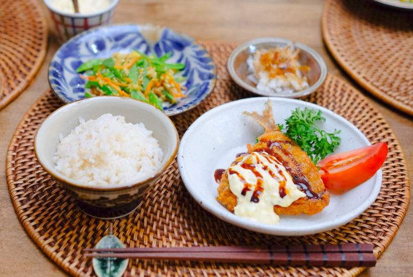 アジフライ、絹さやとにんじんのしりしり、大根サラダ、などの献立 & 「やちむん」のお話し