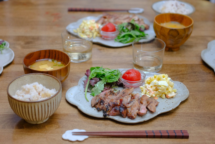 照り焼きチキン、ズッキーニのグリル、トマトのハニーマリネの献立