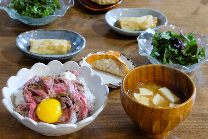 ローストビーフ丼、なすの揚げびたし、ケールとレーズンのサラダ、などの献立