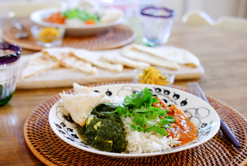 [ad#ad-top] 昨日の夜ごはんです。 二種類のインドカレー、パニール入りのナン、サモサ、それからスパイスたっぷりの発酵キャベツ。 実はこれ、ほとんど手をかけていません。(^^)