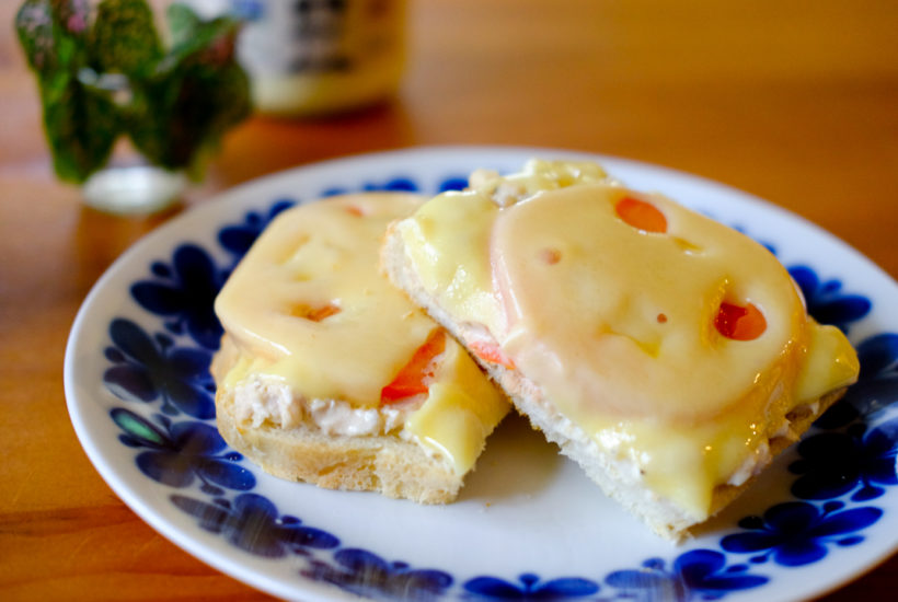 [ad#ad-top] アメリカの定番、「ツナ・メルト」。 本当はパンにはさんで出されることが多いけど わが家のツナ・メルトは、乗せて焼くタイプ、オープンフェイススタイルです。(^^)