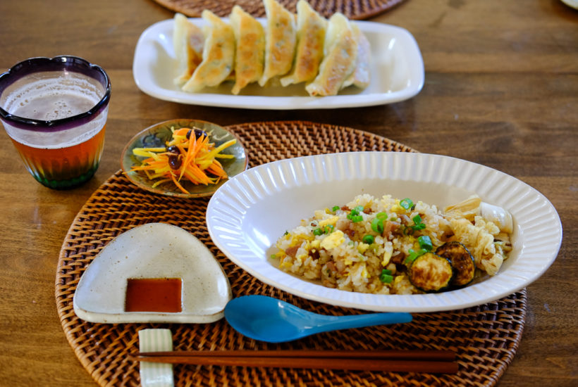 チャーハンと餃子の夜ごはん&おにぎり型のしょうゆ皿
