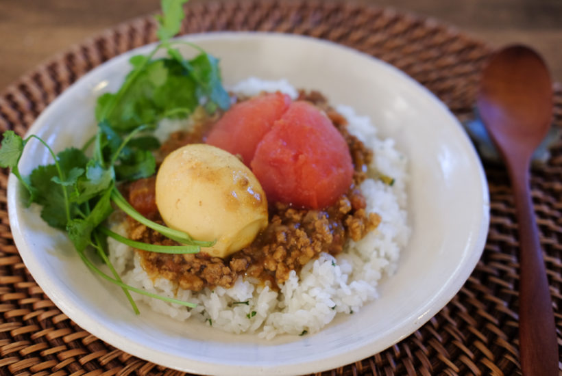 まるごとトマトとたまごを乗せた、キーマカレー