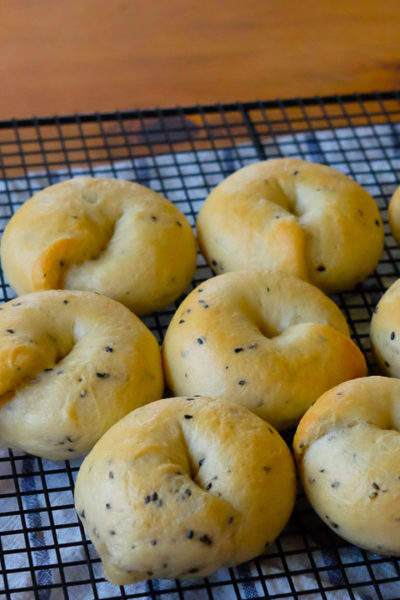 [ad#ad-top] ただいまベーグル生地を、超スロー発酵させているところです。 (写真は、少し前に焼いた、さつまいもと黒ゴマのベーグルです) 粉300gの生地に対して、ドライイーストはたったの1g。…