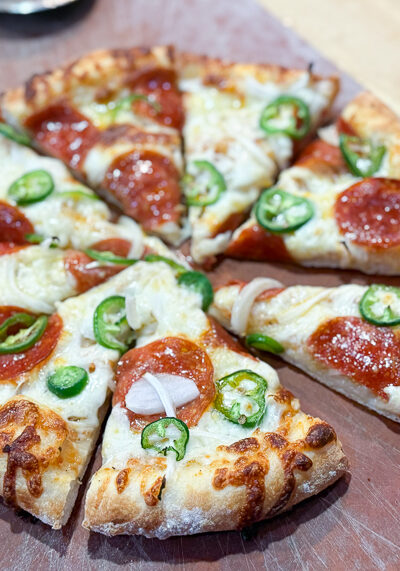 このレシピに、今まで何度助けられたかな。 粉を量るところから、焼き上がりまで1時間あればできてしまう絶品ピザ。 材料もシンプルだしほとんどコネないので本当にストレスなしで作ることができます😊 家にあるものを適当に乗せて。今回はペパロニ&ハラペーニョ&玉ねぎのピザと……
