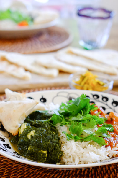[ad#ad-top] 昨日の夜ごはんです。 二種類のインドカレー、パニール入りのナン、サモサ、それからスパイスたっぷりの発酵キャベツ。 実はこれ、ほとんど手をかけていません。(^^)