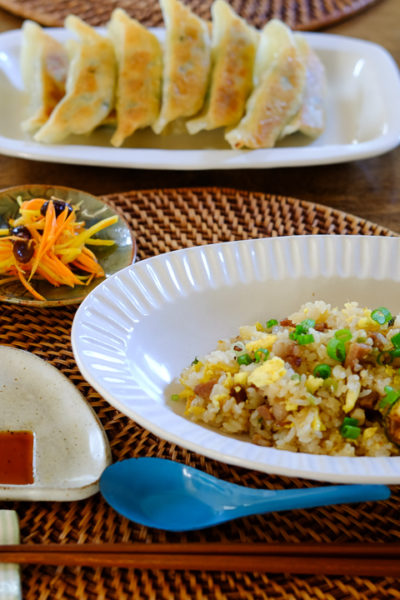 チャーハンと餃子の夜ごはん&おにぎり型のしょうゆ皿
