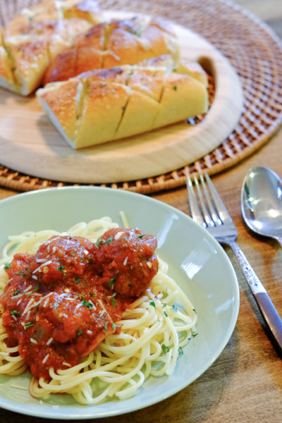 【レシピ】絶品★「ミートボールスパゲティ」と「ガーリック&チーズブレッド」