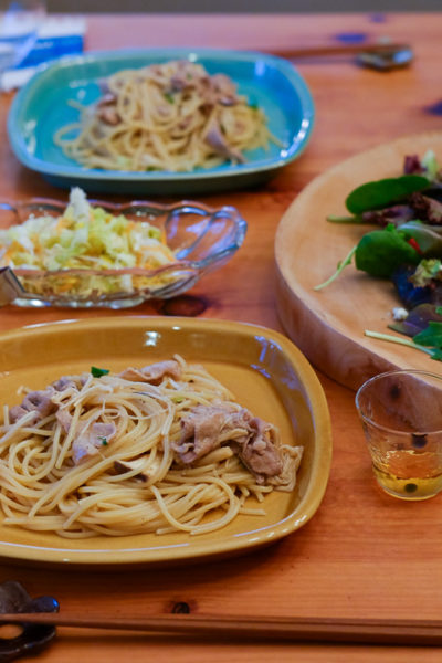 柚子胡椒風味のスパゲティ、ラズベリー入りサラダ、それから「富江アンリミテッド」