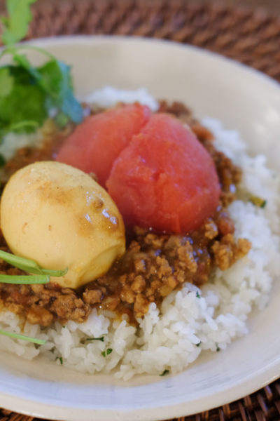 まるごとトマトとたまごを乗せた、キーマカレー