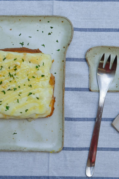 自作の食パン型のお皿たち、と、朝ごはんにぴったりの「チーたまトースト」