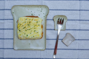 自作の食パン型のお皿たち、と、朝ごはんにぴったりの「チーたまトースト」
